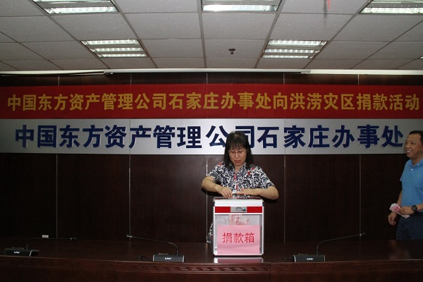 2016年7月,河北省中南部及北部沿海地区突发连续强降雨,局部降特大暴雨,造成了十分严重的洪涝灾害,给人民群众生命财产造成重大损失。为帮助受灾群众共度难关,尽快恢复生产,重建家园,中国东方河北省分公司组织开展向洪涝灾区捐款活动,为洪涝灾区捐款10000元。