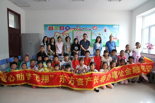 2016年6月,中国东方吉林省分公司组织员工走进双阳区奢岭爱国小学,开展“爱心助梦飞翔”金融知识送村小爱心活动,为奢岭爱国小学的四个社团捐赠了舞蹈服、琴谱、琴架、画板、画笔等课外活动用品。和孩子们一起分享了货币的起源、如何识别和处理假币以及怎样爱护人民币等金融知识,传递爱心,助梦飞翔。